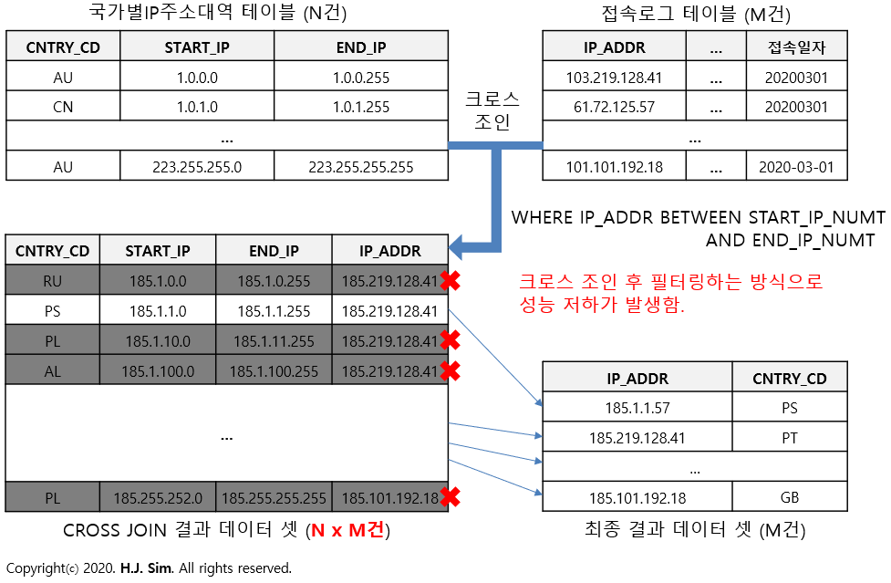 크로스 조인의 부하를 제거하기 위해서는 Equal 조인이 가능하도록 '국가별IP주소대역' 테이블 아키텍처를 변경해 Equal 조인이 가능한 컬럼을 추가해줘야 합니다.
