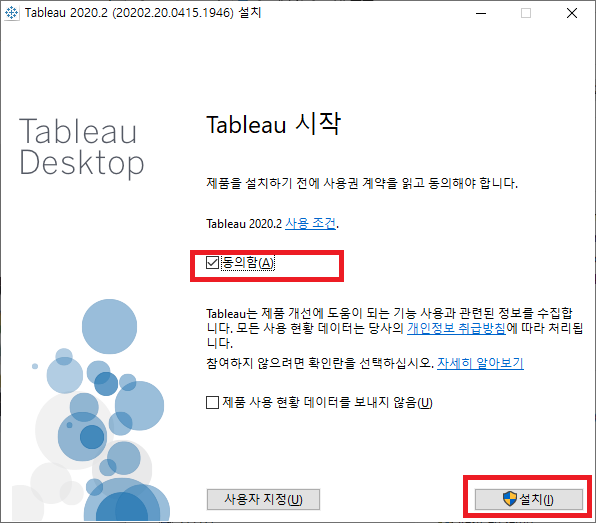 사용권 계약 동의를 위해 '동의함' 체크 박스를 클릭 후 '설치' 버튼을 클릭합니다.