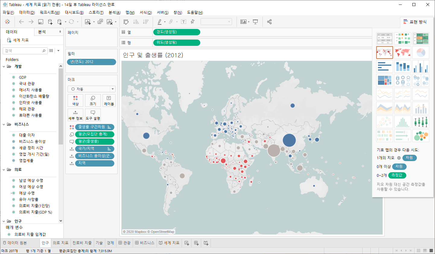 초기 화면 하단에 '샘플 통합 문서'를 클릭하면 Tableau에서 제공하는 샘플 데이터를 확인할 수 있습니다.