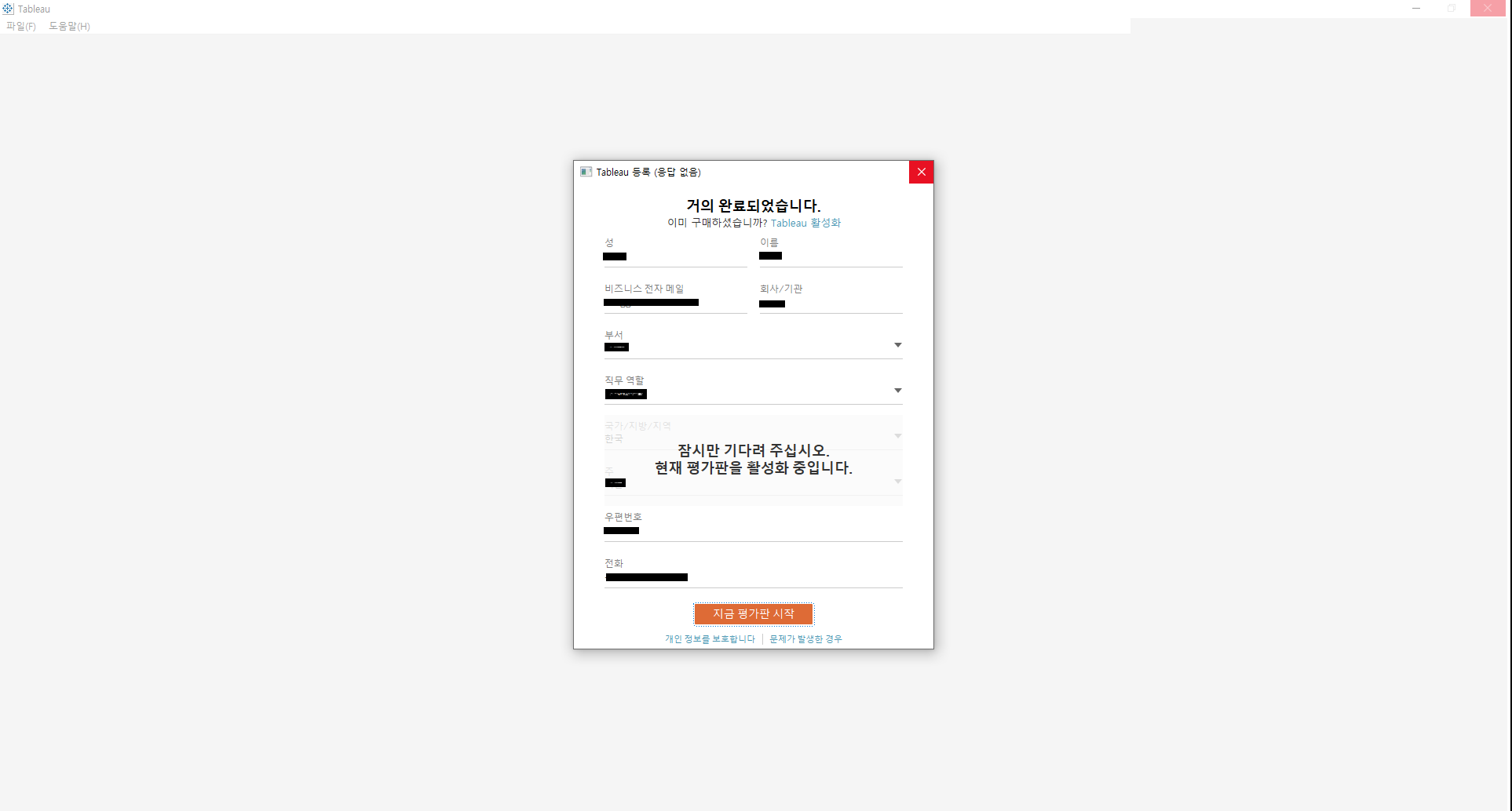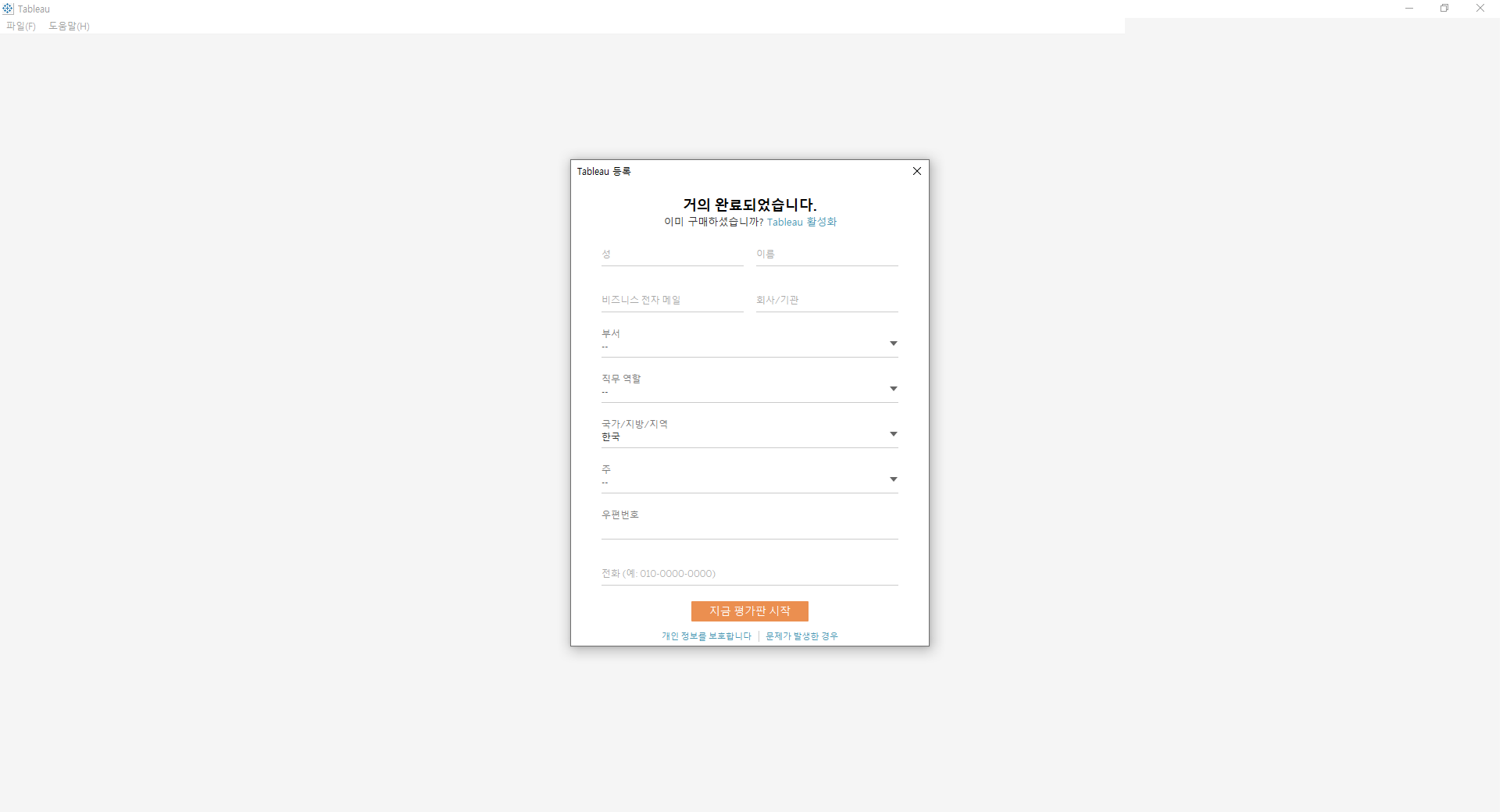 Tableau 를 처음 실행하면 아래와 같이 사용자 기본 정보를 입력해야 합니다.