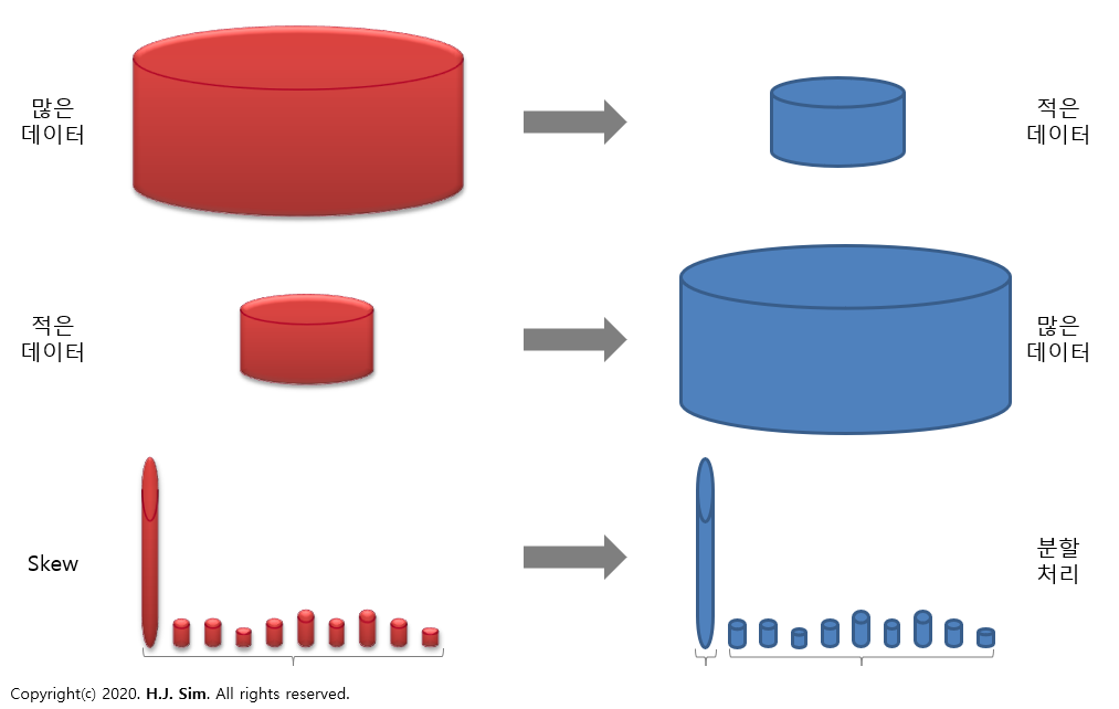 즉, 적은 데이터를 많게 만들어(상세화하여) 데이터의 분포도를 좋게 만들고 Equal 조인이 가능하도록 테이블 아키텍처를 변경해주는 작업이 필요합니다.