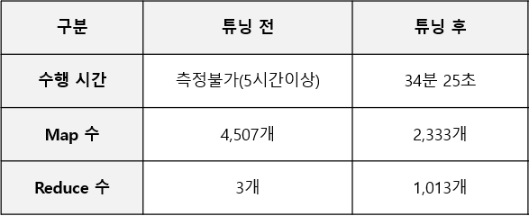 실제 운영 환경에서는 제가 디멘전 테이블 아키텍처 변경과 데이터 입력 작업만 수행하고, 실제 운영상의 쿼리 변경 작업은 운영 담당자가 진행하여 상세한 튜닝 결과는 확인하지 못했습니다. 운영 클러스터에서는 튜닝 전 약 2시간 정도 수행되는 쿼리가 튜닝 후에는 수행 시간이 약 7분 정도로 단축되었다고 합니다.