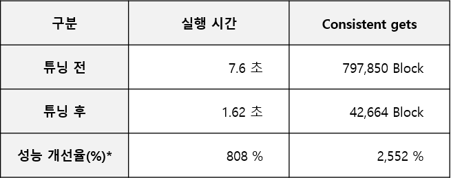 왼쪽 스칼라 서브 쿼리를 사용한 쿼리의 consistent gets 값은 '169,858'입니다. 오른쪽 조인을 사용한 쿼리의consistent gets 값은 '44,835'입니다. 스칼라 서브 쿼리 사용 시 블럭을 읽은 횟수가 약 4배정도 많은 것을 확인 할 수 있습니다.