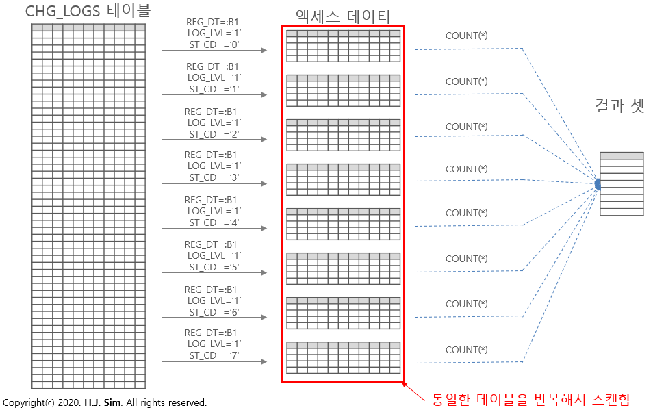 아무튼 SQL 쿼리문은 집합적인 사고로 데이터 액세스를 최소화 할 수 있는 방법을 사용해 작성되어야 합니다. 절차적으로 작성된 쿼리문은 최대한 집합적 관점에서 다시 재작성이 필요합니다.