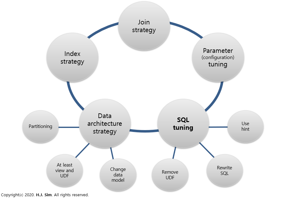 운영중인 데이터베이스에서 성능 저하가 발생하였을 때, 성능 최적화를 위해 선택할 수 있는 가장 큰 대안은 SQL 튜닝일 것입니다. 위에서 언급한 것처럼 운영 중인 시스템의 모델을 변경하거나 인덱스를 추가/변경하는 작업은 영향도가 큰 작업이므로 실제로 적용할 수 있는 기회는 많지 않습니다.