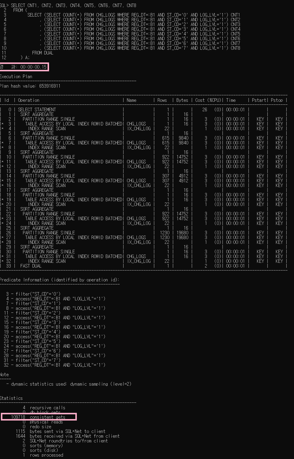 누누히 얘기하지만 SQL의 성능 판단 기준은 실행 시간과 블럭 액세스 횟수입니다.