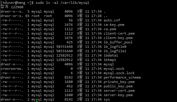 mysql이 처음으로 구동되면 my.cnf의 datadir 옵션에서 설정한 경로에 mysql운영에 필요한 기본 데이터베이스 관련 파일 등이 생성된 것을 확인 할 수 있을 것입니다.