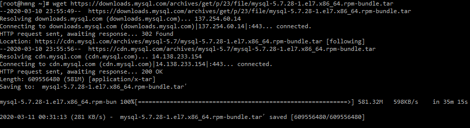 > wget https://downloads.mysql.com/archives/get/p/23/file/mysql-5.7.28-1.el7.x86_64.rpm-bundle.tar