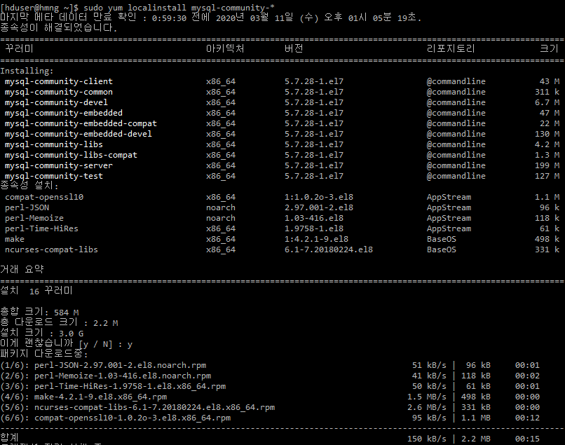 아래와 같이 yum localinstall 명령어를 이용해서 패키지들을 설치해줍니다. rpm 명령어를 사용하여 하나씩 설치해줄 수도 있지만, yum을 사용하면 패키지간의 의존 관계를 참조하여 한번에 설치 가능하므로 여기서는 yum을 이용하여 설치하도록 하겠습니다.