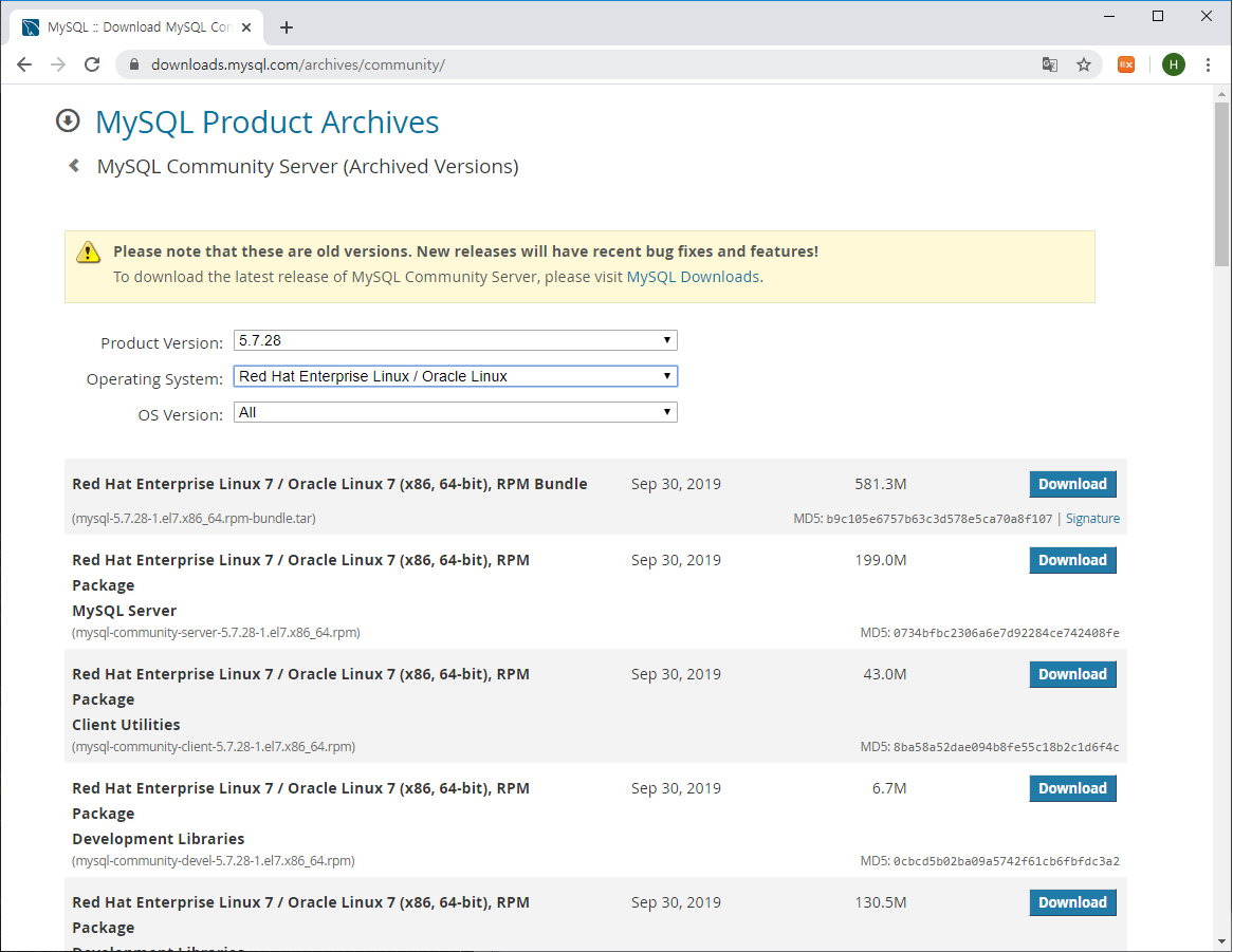 MySQL 사용이 주목적이 아닌 관계로 yum을 이용해 최신 버전의 MySQL(8.0.17)을 쉽게 설치할 수 있었지만, 지금은 Hive metastore로 사용할 목적이므로 Hive와의 안정적인 호환성을 고려하여 5.7 버전을 다운로드 받아 설치하고자 합니다.