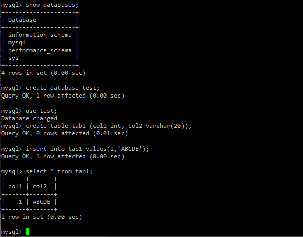 기본 SQL문을 수행하여 MySQL이 정상적으로 동작함을 확인할 수 있습니다.