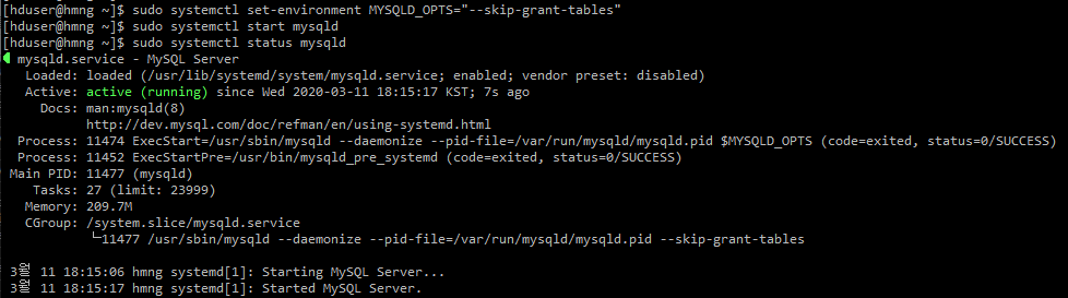 비밀번호 설정이 완료되었으면 --skip-grant-tables 옵션을 비활성화하기 위해 mysql 서비스를 재가동해줘야 합니다.